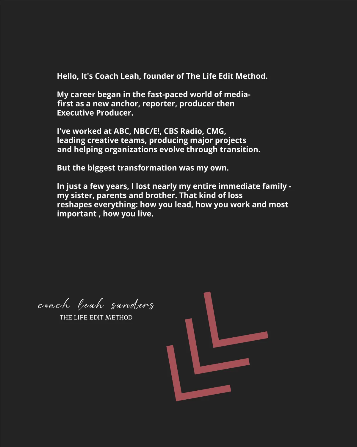 "When my dad died, I lost more than a parent - I lost my business partner and guide. The grief also reopened memories of losing my brother as a child. Leah's method helped me steady myself, lead my family through the storm, and find a new path forward I didn't think existed."